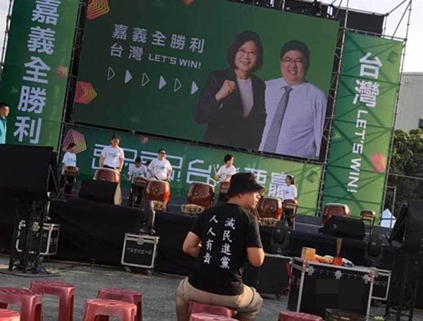 有名網(wǎng)友上傳一張照片到臉譜網(wǎng),照片中一名男子穿著黑衣,上面寫(xiě)著“滅民進(jìn)黨人人有責(zé)”的字樣,坐在蔡英文以及蔡易余聯(lián)合造勢(shì)場(chǎng)的舞臺(tái)前。