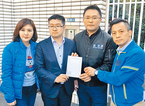 國(guó)民黨臺(tái)北市議員李明賢(右起)、張斯綱、徐弘庭及王欣儀等人,4日來(lái)到臺(tái)當(dāng)局“駐日代表處”遞交陳情書,要求“駐日代表”謝長(zhǎng)廷說(shuō)清楚。(圖片來(lái)源:臺(tái)灣“中時(shí)電子報(bào)”)