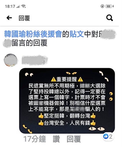 韓國(guó)瑜臉譜網(wǎng)(facebook)粉絲專(zhuān)頁(yè)上有“韓粉”留言提醒出現(xiàn)選舉“奧步”(詭計(jì)),想讓投韓國(guó)瑜的選票變無(wú)效票,提醒大家千萬(wàn)不要受騙。從網(wǎng)友貼出的截圖可以看到,有一則貼文稱(chēng)“重要提醒!民進(jìn)黨無(wú)所不用其極,2020大選除了堅(jiān)持投韓國(guó)瑜以外,記得一定要在選票上寫(xiě)一個(gè)‘韓’字,計(jì)票時(shí)才不會(huì)被做掉!別相信什么選票上不能寫(xiě)字,那是蔡英文當(dāng)局騙人的!”還不忘喊話“堅(jiān)定挺韓,翻轉(zhuǎn)臺(tái)灣”。