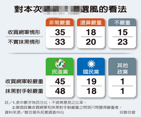 臺灣《聯(lián)合報》進一步分析發(fā)現(xiàn),在“蔡賴配”支持者中,各有近20%認為民進黨在收買網(wǎng)軍及抹黑對手上操作負面選舉的情況更嚴重。
