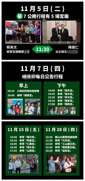 鄭照新還攤出蔡英文辦公室公布的詳細(xì)行程表,證明蔡英文有多天幾乎全天不斷跑場在參拜各地宮廟。他痛批,這是蔡英文辦公室官方公布的公務(wù)行程,還是日常上班時間,旁邊的“立委”候選人身披競選戰(zhàn)袍,甚至公開拉票,這難道沒有違反行政中立嗎?