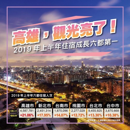 從韓國瑜拿出“交通部觀光局”臺灣旅宿網(wǎng)的數(shù)據(jù)可以看出,高雄市在2019年上半年住宿人次高達458萬7781人,成長率21.06%,名列“六都”第一。新北市住宿人次達245萬1314人,成長率17.95%,位居第二。臺南市住宿人次為187萬5096人,成長率14.07%,排名第三。(中國臺灣網(wǎng) 王琳)