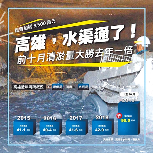 韓國(guó)瑜13日在臉譜網(wǎng)貼出“高雄,水渠通了”,表示今年前10月下水道清淤量達(dá)95.5萬噸,是去年民進(jìn)黨執(zhí)政時(shí)的1倍。(圖片取自臺(tái)媒)