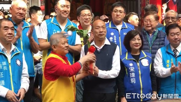 韓國(guó)瑜出征基隆與“立委”候選人宋瑋莉一同拜開(kāi)漳圣王,并收下白菜頭盼當(dāng)選。(圖片來(lái)自:臺(tái)灣“東森新聞云”)