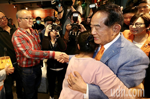 宋楚瑜(右二)與副手人選余湘(右一)在晚上在競選總部發(fā)表感想。隨后離開總部時一一向支持者握手、擁抱謝票。(圖片來源:臺灣《聯合報》)