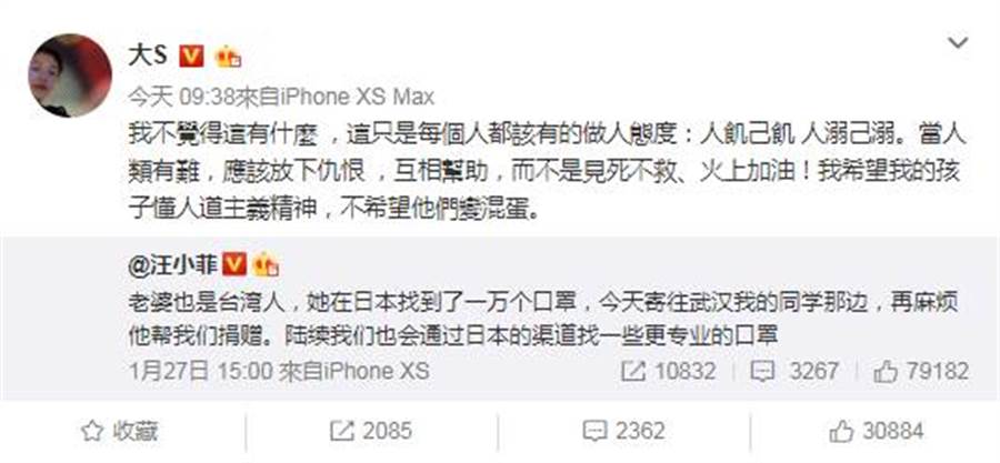 中國(guó)臺(tái)灣網(wǎng)1月28日訊 汪小菲27日在微博透露,妻子大S在日本狂掃1萬(wàn)個(gè)口罩,并表示會(huì)捐到武漢去,小S也力挺姐姐的行為,此舉讓網(wǎng)友非常感動(dòng)。大S今早也發(fā)微博響應(yīng)“這只是每個(gè)人都該有的做人態(tài)度!