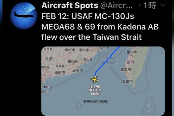 中國(guó)臺(tái)灣網(wǎng)2月12日訊 據(jù)臺(tái)灣“聯(lián)合新聞網(wǎng)”報(bào)道,美國(guó)社交媒體賬號(hào)”飛機(jī)守望”12日披露,美國(guó)空軍兩架編號(hào)MEGA68、MEGA6869的MC-130J特戰(zhàn)運(yùn)輸機(jī),今天中午沿臺(tái)灣海峽中線,由北向南飛行,穿越臺(tái)灣海峽上空。根據(jù)該社交媒體賬號(hào)披露的航跡,未交待兩機(jī)最后去向,但根據(jù)過去慣例,通常是飛返嘉手納基地。