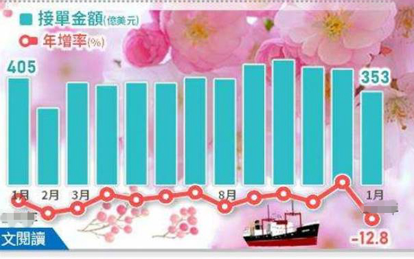 臺灣地區(qū)1月份外銷訂單金額統(tǒng)計為353.1億美元,7大類項目訂單受到產(chǎn)業(yè)淡季及及春節(jié)因素,金額全面減少。(圖片取自臺媒)