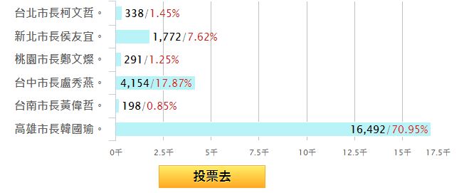 截至28日早上8點47分許,共計有23245票,民進(jìn)黨籍桃園市長鄭文燦只獲得291票,僅占1.25%;民進(jìn)黨籍臺南市長黃偉哲獲得198票,占總票數(shù)0.85%;無黨籍臺北市長柯文哲拿到338票,占總票數(shù)1.45%。國民黨籍臺中市長盧秀燕獲得4154票,占總票數(shù)17.87%;國民黨籍高雄市長韓國瑜拿下16492票,高達(dá)總票數(shù)70.95%,新北市張侯友宜拿下1772票,占總票數(shù)7.62%。(中國臺灣網(wǎng) 李寧)