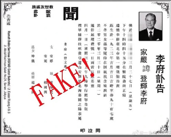李登輝病逝訃告驚現(xiàn)網(wǎng)絡(luò) 臺灣調(diào)查部門表示為假消息呼吁勿轉(zhuǎn)發(fā)