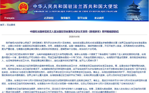 4月6日,中國駐法國使館官網(wǎng)刊文《中國駐法國使館發(fā)言人就法國議員聯(lián)署有關(guān)涉臺(tái)文章致<新觀察家>周刊編輯部的信》。(圖片來源:中國駐法大使館官網(wǎng))