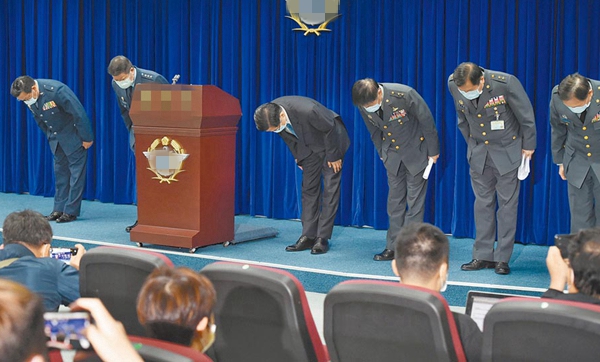 在輿論壓力下,民進黨當局防務主管部門負責人嚴德發(fā)(右四)21日晚開記者會向社會鞠躬道歉。(圖片來源:臺灣《中國時報》)