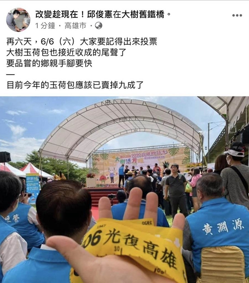 2020高雄鳳荔季開幕典禮30日上午舉行,韓國瑜與多位局處首長、議員均出席這場盛事,民進黨議員邱俊憲也參加了這場活動。儀式進行到請在場來賓上臺時,包括司儀、高雄市新聞局長鄭照新皆上前邀請邱俊憲一同上臺,但他當場婉拒,仍然坐在臺下貴賓區(qū)。不料,沒多久邱俊憲就在臉譜網(wǎng)發(fā)文,寫著“再六天,6/6(六)大家要記得出來投票”,并附上一張在臺下手拿“光復(fù)高雄”黃絲帶、臺上韓國瑜正在頒獎的照片。