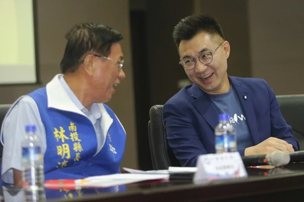 國民黨行動中常會昨天在南投舉行,黨主席江啟臣(右)與南投縣長林明溱(左)討論黨務(wù)規(guī)劃。(圖片來源:臺灣《聯(lián)合報》)