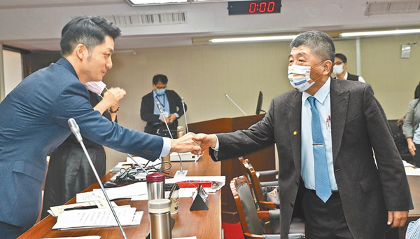 臺“立法院”12日舉行“開放含萊克多巴胺豬肉進口,對民眾健康之影響與危害”公聽會,會議結(jié)束后,臺當局“衛(wèi)福部長”陳時中(右)趨前向“召委”蔣萬安(左)握手致意。(圖片來源:臺灣“中時新聞網(wǎng)”)