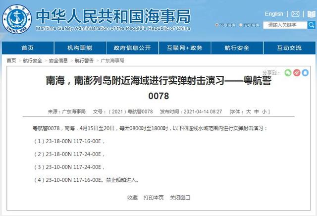 海事局宣布在南海、南澎列島附近進(jìn)行實(shí)彈射擊演習(xí) 美司令再提“軍事威脅”論。(圖片來自官網(wǎng)截圖)