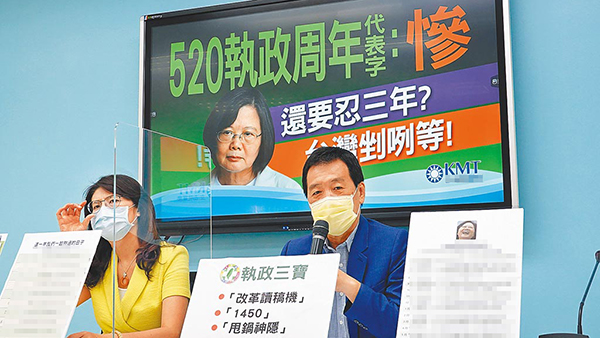 臺立法機(jī)構(gòu)國民黨黨團(tuán)則以“這一年我們一起熬過的日子”,來形容民進(jìn)黨當(dāng)局連任后首年施政表現(xiàn),書記長鄭麗文痛批,民進(jìn)黨施政弊端已經(jīng)罄竹難書,臺灣正處于缺水、缺電、缺疫苗,防疫警戒進(jìn)入第三級,只能用一個“慘”形容,呼吁蔡英文誠懇地為執(zhí)政不力道歉。
