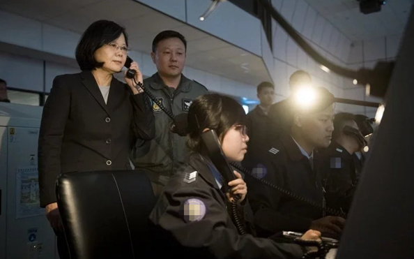 圖為臺灣地區(qū)領(lǐng)導(dǎo)人蔡英文視察臺空軍作戰(zhàn)指揮部。(圖片取自臺媒)