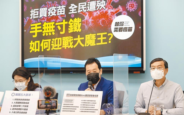 中國(guó)國(guó)民黨黨團(tuán)28日召開(kāi)“拒買疫苗,全民遭殃”記者會(huì)。(圖片來(lái)源:臺(tái)灣“中時(shí)新聞網(wǎng)”)