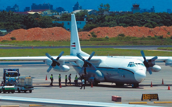 美C-130運輸機(jī)19日降落臺灣桃園機(jī)場。(圖片來源:臺灣“中時新聞網(wǎng)”)