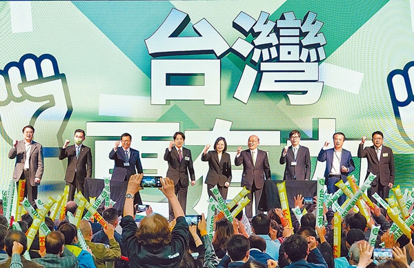 民進(jìn)黨14日舉行黨員代表大會(huì),蔡英文(中)率眾呼吁四項(xiàng)“公投”“四個(gè)不同意”立場(chǎng)。(圖片來(lái)源:臺(tái)灣“中時(shí)新聞網(wǎng)”)