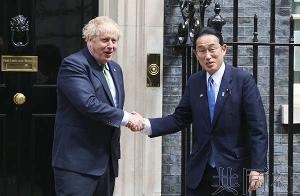 5月5日,日本首相岸田文雄和英國首相約翰遜(左)在會談前握手。(來源:日媒)