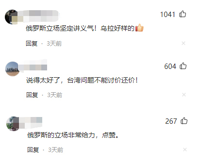 俄羅斯在涉及核心利益問(wèn)題上對(duì)中方表達(dá)的堅(jiān)定支持,在社交媒體上引發(fā)熱議。有網(wǎng)友在中國(guó)臺(tái)灣網(wǎng)官方社交賬號(hào)上留言指出,“俄羅斯立場(chǎng)堅(jiān)定講義氣!烏拉好樣的!薄罢f(shuō)得太好了,臺(tái)灣問(wèn)題不能討價(jià)還價(jià)!”“俄羅斯的立場(chǎng)非常給力,點(diǎn)贊。”“感謝俄羅斯朋友對(duì)中國(guó)統(tǒng)一大業(yè)的支持!”“俄羅斯敢做敢為,為正義發(fā)聲點(diǎn)贊。”“敢于支持中國(guó)仗義執(zhí)言,點(diǎn)贊了!”“中俄攜手,共筑和平!”