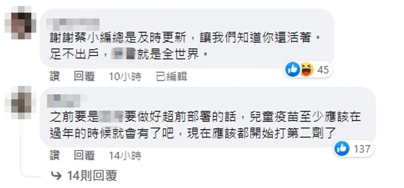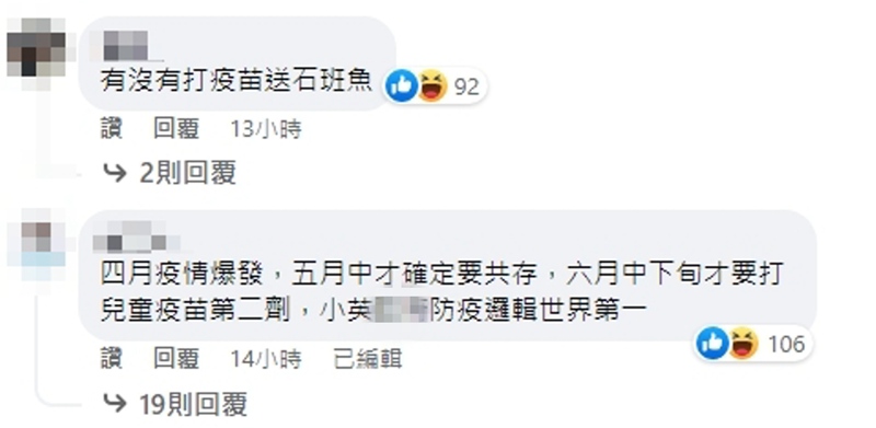 此文一出,立即涌入超過2200條留言,并多為批評聲。有網(wǎng)友表示,“謝謝蔡小編總是及時更新,讓我們知道你還活著”“若你真的努力,兒童疫苗現(xiàn)在應(yīng)該已開始打第二劑了”“行動后知后覺,嘴巴超前部署”;還有人諷刺,“打疫苗送不送石斑魚?”