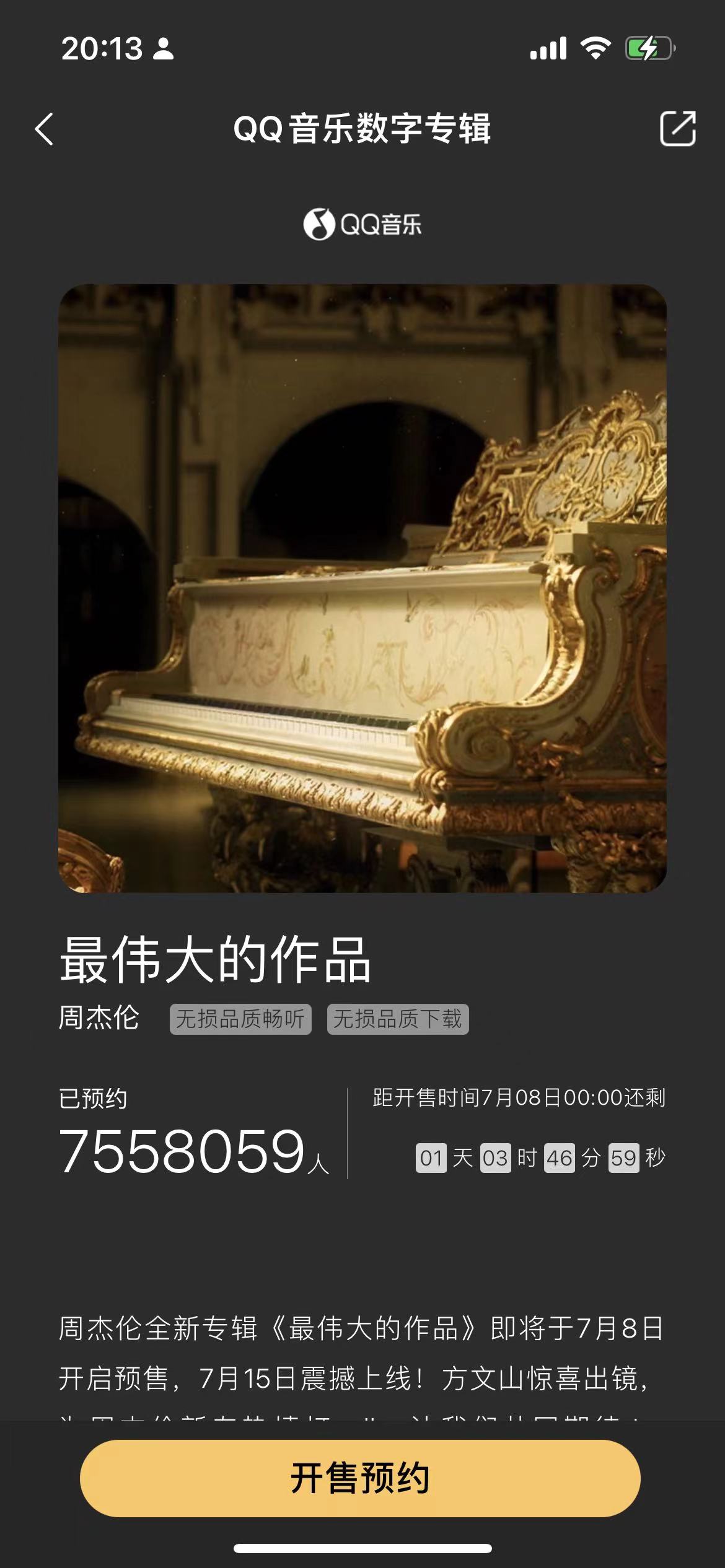 據(jù)QQ音樂顯示,周杰倫第15張專輯《最偉大的作品》先行曲MV將于7月6日中午12時(shí)首播上線!蹲顐ゴ蟮淖髌贰窋(shù)字專輯預(yù)約現(xiàn)已開啟,截至7月6日20時(shí),預(yù)約人數(shù)超755萬人次,將于7月8日開啟預(yù)售,7月15日上線。