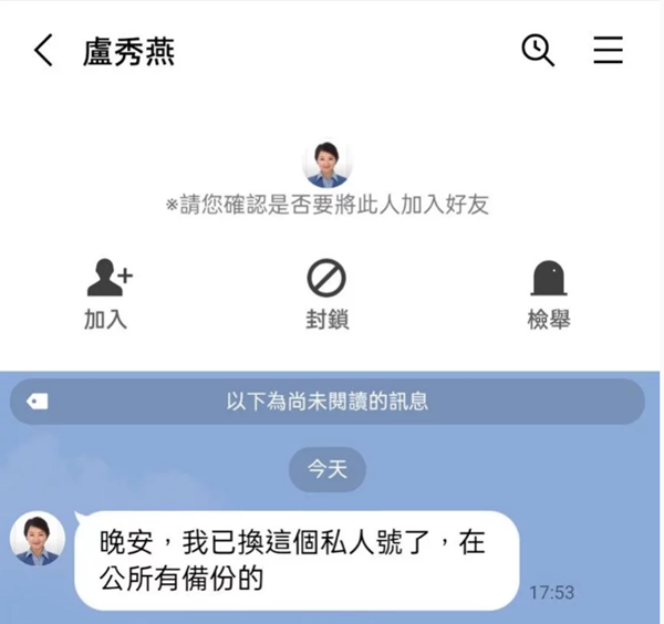 中國臺(tái)灣網(wǎng)9月29日訊 據(jù)臺(tái)灣《聯(lián)合報(bào)》報(bào)道,有市民向臺(tái)中市政府反映,發(fā)現(xiàn)有人冒用市長盧秀燕頭貼、姓名的Line賬號(hào),到處加人好友與對(duì)話,疑似詐騙,手法與臺(tái)中市各區(qū)長遭冒用情況一樣。臺(tái)中市政府提醒市民,假賬號(hào)猖獗,切勿受騙上當(dāng),盧秀燕不會(huì)叫人匯款等,市政府已報(bào)警處理。