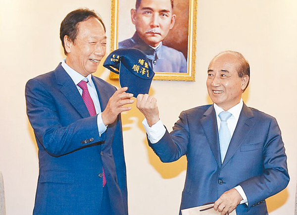 圖為郭臺銘日前拜會王金平并贈送月餅,王回贈郭帽子。(圖片來源:臺灣“中時新聞網(wǎng)”)