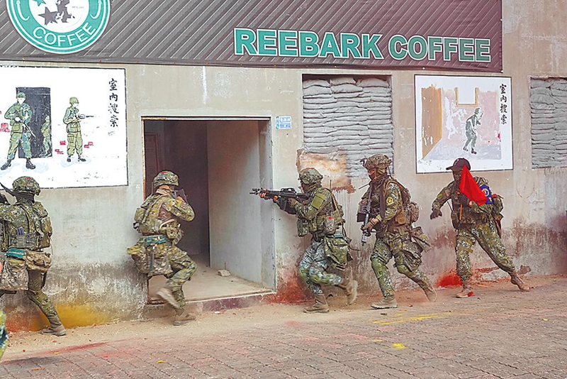 圖為2022年臺陸軍步訓(xùn)部學(xué)員模擬“城鎮(zhèn)戰(zhàn)”。(圖片來源:臺灣“中時新聞網(wǎng)”)