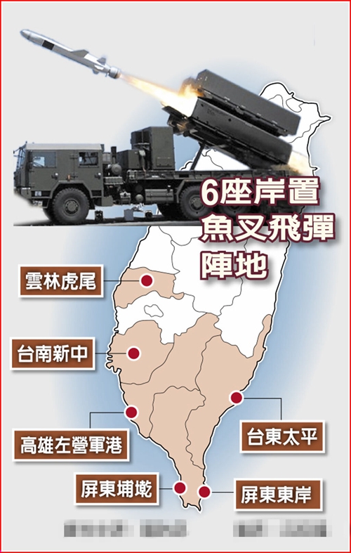 據(jù)報道,6座岸置魚叉導(dǎo)彈陣地分別設(shè)在云林虎尾、臺南新中、高雄左營軍港、屏東東岸、屏東埔墘及臺東太平等處,并將建住辦大樓、生活營舍、車輛組及車庫、維修與測彈廠房、庫儲導(dǎo)彈間及附屬設(shè)施,預(yù)算編列約102億余元。