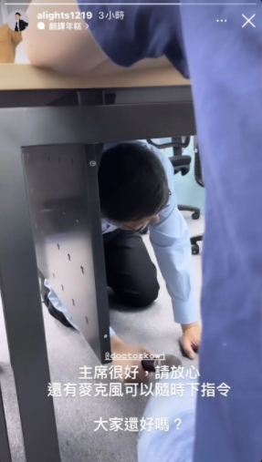 柯文哲在地震發(fā)生第一時(shí)間躲到桌下避難。(圖片來自李頂立社交媒體)