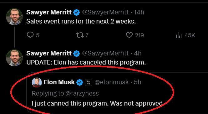 沒想到這則帖文被特斯拉創(chuàng)始人兼首席執(zhí)行官埃隆·馬斯克刷到,但他卻在下方留言說,此活動(dòng)未經(jīng)允許,已取消。(編輯/劉佳辰)
