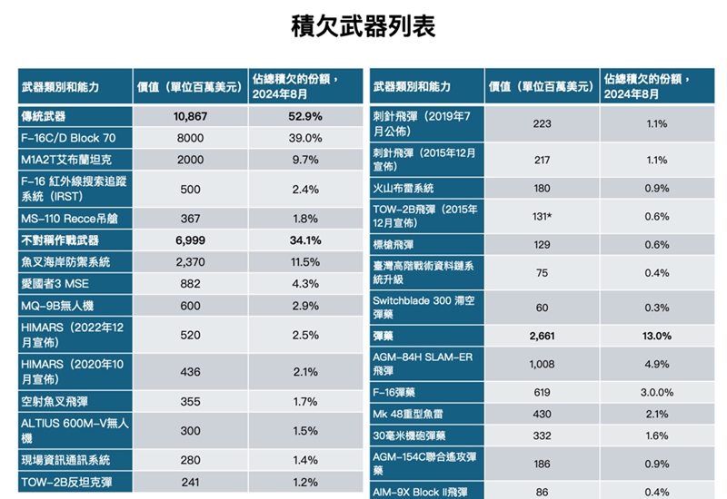 美國對臺積欠武器清單。(圖片來源:臺灣“中時新聞網(wǎng)”)