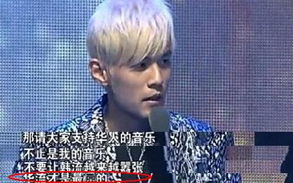 再比如,周杰倫在2012年4月全球華語榜中榜頒獎典禮上領(lǐng)獎時說“希望所有的歌手可以團(tuán)結(jié)起來,因為華人的音樂是最屌的”;同年12月的百度沸點慶典上,狂攬3項年度大獎的周董依舊不改力挺民族文化的本色,公開“叫囂”韓流:“不要讓韓流越來越囂張,華流才是最屌的。”