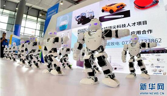 9月12日,智能機(jī)器人在南寧國(guó)際會(huì)展中心跳起“集體舞”。(圖片來(lái)源:新華社記者黃孝邦)