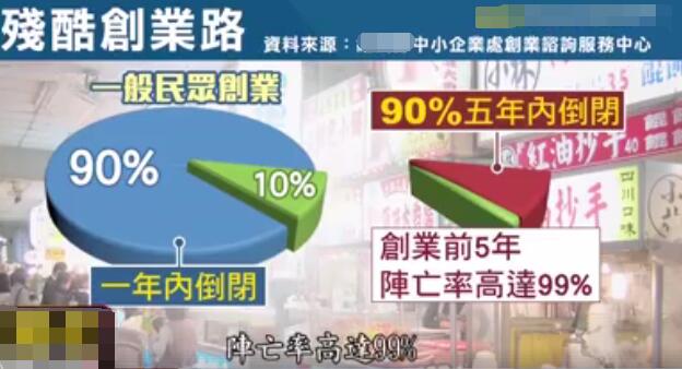 根據(jù)臺(tái)灣“經(jīng)濟(jì)部中小企業(yè)處”統(tǒng)計(jì),在臺(tái)灣創(chuàng)業(yè)一年內(nèi)就倒閉的機(jī)率高達(dá)九成;能撐過(guò)前五年的創(chuàng)業(yè)家,只有1%,99%的高“陣亡率”比美國(guó)、新加坡等地還恐怖。