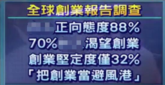 在臺(tái)媒給出的另一份“全球創(chuàng)業(yè)報(bào)告調(diào)查”中我們還可以看到,全臺(tái)對(duì)“創(chuàng)業(yè)”持正向態(tài)度的比例高達(dá)88%,有70%的人渴望創(chuàng)業(yè),但對(duì)創(chuàng)業(yè)有“堅(jiān)定度”的人僅有32%。
