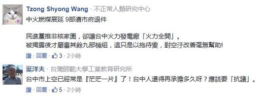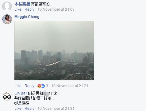 “空氣真的很差,我兒子氣喘都發(fā)作了”、“臺中會在第一線用肺幫全臺灣過濾”,深處“霾”伏中的臺中民眾除了憤怒就是無奈,“為了實現執(zhí)政者的‘非核家園’理想而‘屠殺’無辜民眾”、“臺中火力發(fā)電就吸飽飽了,用肺過濾空氣,我們的爛領導人卻還在‘用愛發(fā)電’”。