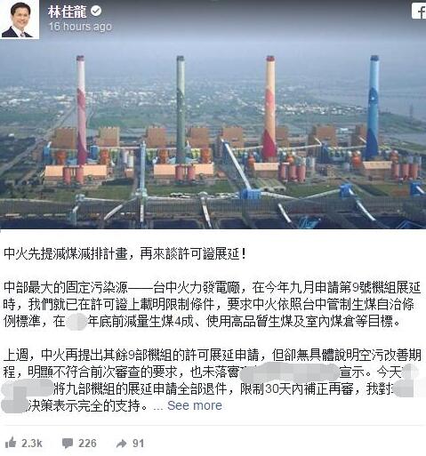 再回頭看看臺中火力發(fā)電廠那一根根大煙囪吧,它們被直指是危害中部空氣品質的“殺手”,顏寬恒曾上傳過一張臺中電廠的照片,“嗯??我剛剛到臺中電廠,猛一看發(fā)現‘煙囪不見了’”,還調侃說是以為“蔡當局痛定思痛了”。