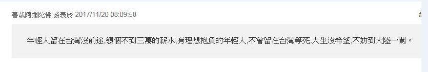 臺(tái)灣網(wǎng)友也給出了解釋?zhuān)_(tái)灣被“空心菜”搞得虛無(wú)縹緲,大陸卻是一片熱火朝天:“綠營(yíng)”為私欲而搞“本土化”,結(jié)果令臺(tái)灣優(yōu)勢(shì)盡失,經(jīng)濟(jì)嚴(yán)重下滑,找工作也越來(lái)越難,有理想有抱負(fù)的臺(tái)灣青年與其在臺(tái)灣“等死”,不如到大陸求發(fā)展。