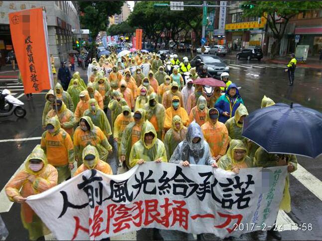 臺(tái)灣高速公路收費(fèi)員與桃園空服員工會(huì)曾在臺(tái)當(dāng)局“勞動(dòng)部”前舉行“人前風(fēng)光給承諾 人后陰狠捅一刀”游行。(圖片來(lái)源:臺(tái)灣“中時(shí)電子報(bào)”)