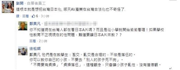 臺中某高中教務(wù)主任則強調(diào),如今性別教育已向下延伸至小學高年級學生,雖然孩子在生理上提早成熟,但心理不見得同步成熟,教材若讓孩子解讀成錯誤的性觀念,性教育反而變成性解放,難保日后臺灣不會教出“豪放女”或“縱欲男”。