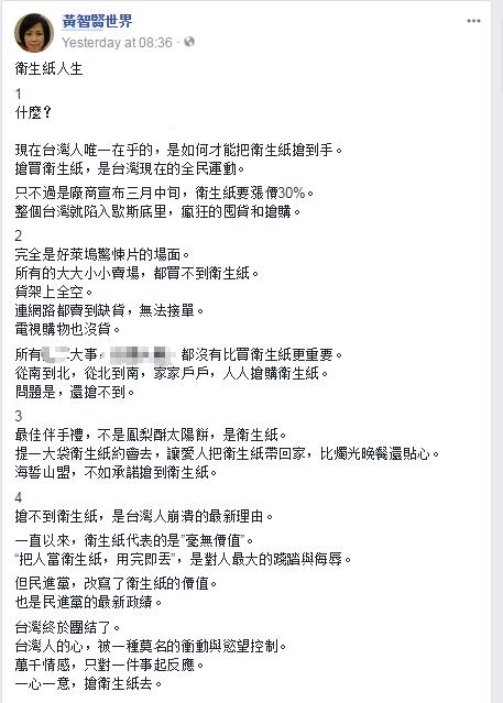 臺(tái)灣政論節(jié)目主持人黃智賢則發(fā)文說(shuō),所有大事,都沒(méi)有比買(mǎi)衛(wèi)生紙更重要,而“搶不到衛(wèi)生紙,是臺(tái)灣人崩潰的最新理由”;更嘲諷道,一直以來(lái)衛(wèi)生紙代表的是“毫無(wú)價(jià)值”,但民進(jìn)黨改寫(xiě)了衛(wèi)生紙的價(jià)值,這“也是民進(jìn)黨的最新政績(jī)”了。