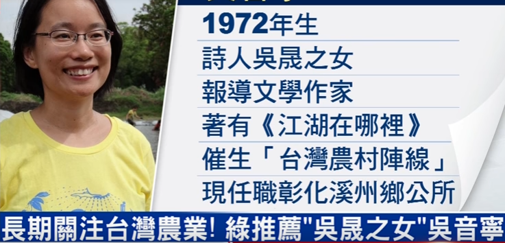 臺(tái)媒報(bào)道,吳音寧過(guò)去曾遁入墨西哥叢林生活,也曾寫書探討臺(tái)灣農(nóng)業(yè)問(wèn)題,當(dāng)時(shí)以為寫作會(huì)是她人生的志業(yè)。沒(méi)想到的是,表哥黃盛祿選上彰化溪州鄉(xiāng)長(zhǎng),缺個(gè)幫手;吳音寧不顧父親吳晟的反對(duì),決心幫忙,成了鄉(xiāng)公所主任秘書。
