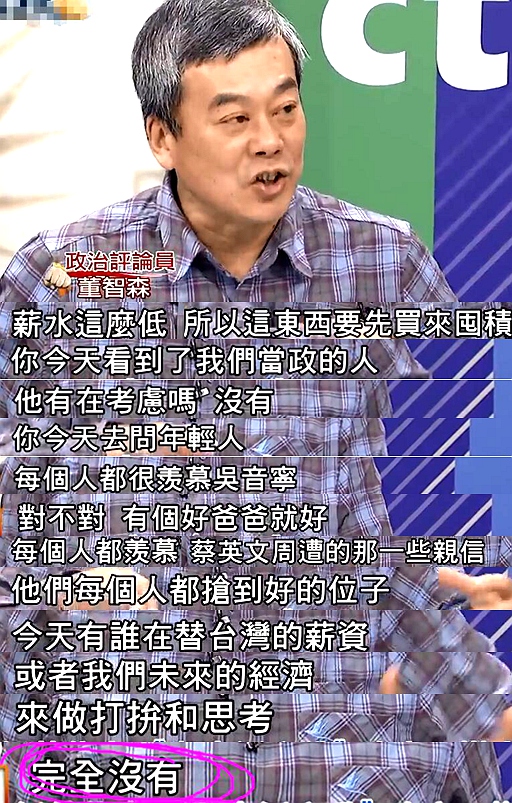政治評論員董智森表示,薪水已經(jīng)這么低了,但并沒有看到臺當(dāng)局有人為經(jīng)濟(jì)做打拼和思考,他還調(diào)侃,如今島內(nèi)年輕人都很羨慕那個“有個好爸爸”的吳音寧及蔡英文周遭的親信,因為“每個人都能搶到(拿錢多還不用干事兒啊)好位置”。