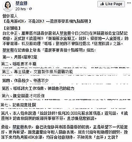 眼見勢頭不對,蔡宜珊馬上在網(wǎng)上駁斥臺媒“報道不實”,并列出了10點聲明。具體的長篇大論侃爺就不多贅述了,給各位把“知識點”梳理了一下,自行看圖解惑吧~總之大體內(nèi)容就是一句話:有“刁民”要阻礙我的議員選舉路!