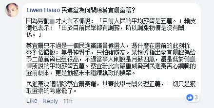 民進黨臺北市議員擬參選人蔡宜珊日前被前助理控訴是“血汗老板”,但蔡回應(yīng)時竟說“薪水2萬(新臺幣,下同)算很高,沒虧欠助理”,此話一出立即引發(fā)了熱議;這還不算完,人家之后更爆猛料,“我以前在陳水扁、謝長廷、姚文智總部當助理,也沒有勞健保呀”,一句話就成功棒打三位綠營大咖,被網(wǎng)友調(diào)侃是“民進黨最強豬隊友”。